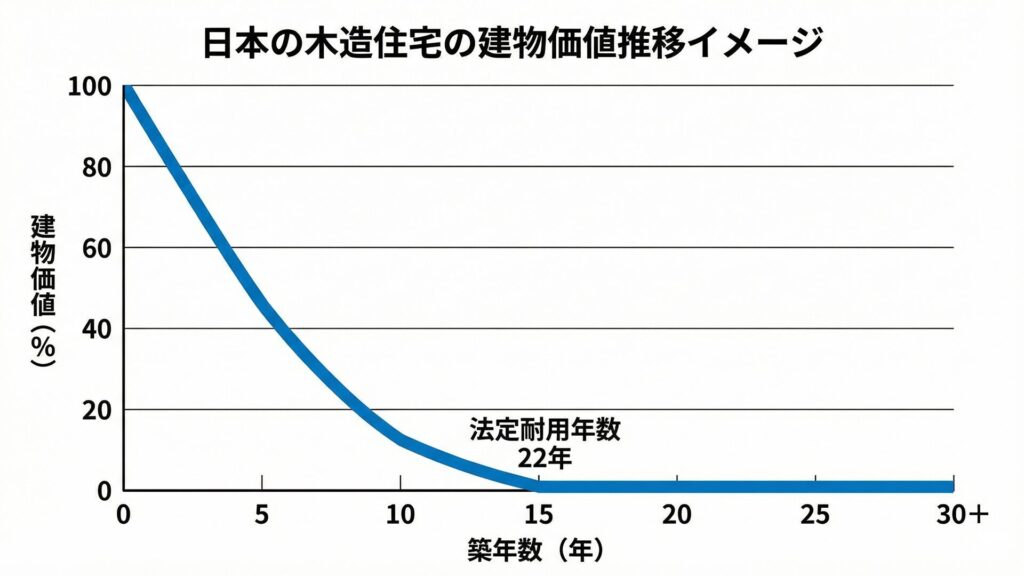 そして厄介なのは、減価償却そのものよりも、それが引き起こす“常識”です。会計のルールが、そのまま市場の感覚に染み込んでしまう。結果として、築年数が進んだ木造住宅は、実際の状態に関係なく「建物はほぼゼロ」と扱われやすくなります。